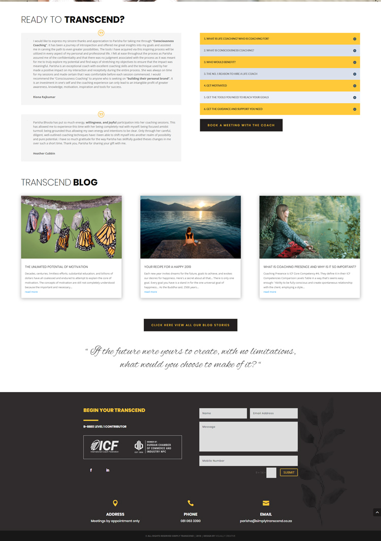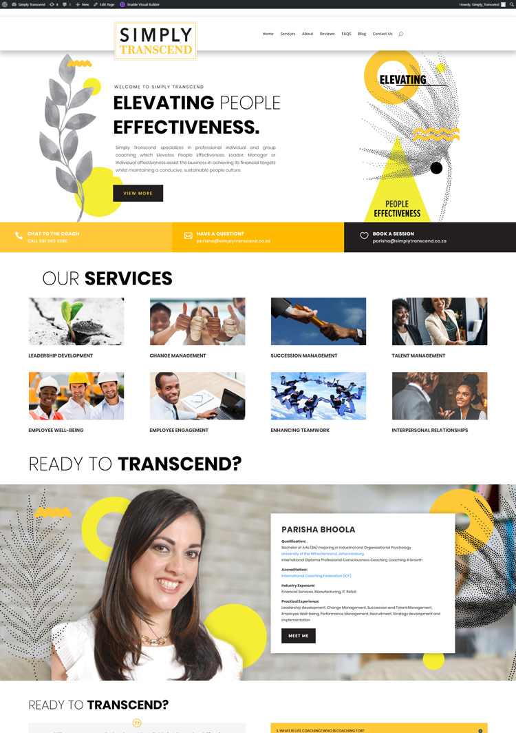 Parisha Bhoola, a Professional ICF Certified Coach, enlisted the services of Visually Creative to build her company’s website, Simply Transcend. Beforehand, Parisha had her branding meticulously crafted and now desires us to adhere closely to her brand guidelines during the development process. Her vision is to create a website that narrates her story in a highly professional manner, striking the perfect balance between simplicity and effectiveness.